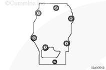 一個缸蓋上的所有螺栓(1 到 6 號)都擰緊到 217 N•m [160 ft-lb] 后,必須將這些螺栓沿擰緊的方向再轉 90 度。將螺栓擰緊至 217 N•m [160 ft-lb] 后,在缸蓋和 12 角螺栓頭上做標記,以便為額外的轉動提供參考點。轉動螺栓,直到缸蓋上的指示標記在第三和第四角頭之間。