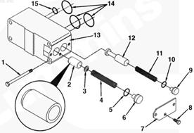1六角頭螺栓 - 4 - M10 x 1.50 x 90,2旁通閥柱塞 – 1,3墊片 – 1,4閥彈簧 – 1,5 O 形密封圈 – 1,6固定塞 – 1,7蓋板 – 1,8六角頭螺栓 - 3 - M8 x 1.25 x 12,9固定塞 – 1,10 O 形密封圈 – 1,11壓縮彈簧 – 1,12壓力調節器閥 – 1,13旁通閥閥體 – 1,14 O 形密封圈 – 3,15 O 形密封圈 - 1。