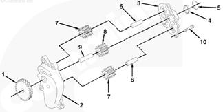 1機油泵驅動齒輪,2機油泵泵體,3機油泵蓋,4襯套,5 O 形密封圈,6機油泵從動齒輪軸,7機油泵驅動齒輪,8機油泵主驅動齒輪,9機油泵主驅動軸,10六角頭螺栓 (5) - M8 x 1.25 x 20。