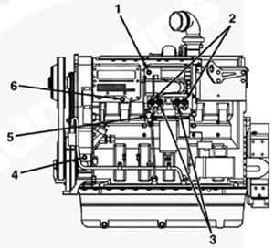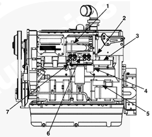 1排氣歧管,2渦輪增壓器機油進口,3渦輪增壓器,4節溫器殼通風口,5節溫器殼,6發動機冷卻液出口,7冷卻液溫度傳感器,8水泵,9冷卻液濾清器,10發動機放油口,11組合式全流/旁通機油濾清器,12機油冷卻器,13飛輪殼,14發動機生產序號(ESN),15渦輪增壓器機油回油口。