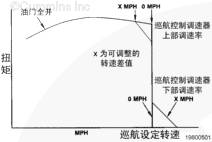 下部調速率 — 此特性允許實際車速在輕負荷條件下(比如,下坡)從巡航控制速度略微提高。當此特性調整到其最大值 3 mph 時,車輛的動量得到保留,因而應產生更好的燃油經濟性。當此特性調整到其最小值 0 mph 時,車輛控制得到保持。