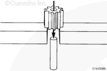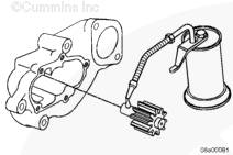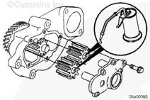 通過緩慢轉(zhuǎn)動(dòng)驅(qū)動(dòng)齒輪和檢查泵齒輪是否損壞來檢查機(jī)油泵能否繼續(xù)使用。如果機(jī)油泵內(nèi)有零件損壞,則此泵必須大修或更換。有關(guān)大修的詳細(xì)信息,請(qǐng)參考《 QST30 大修手冊(cè)》(公告號(hào) 3666190)中的第 7 節(jié)。