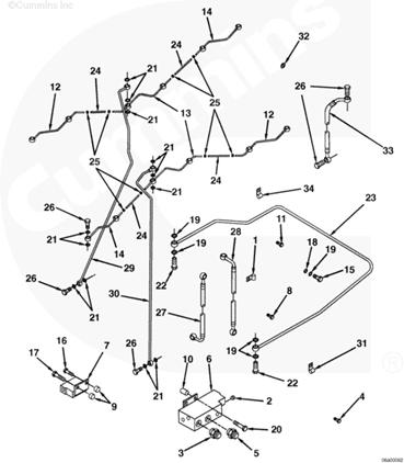 1右排歧管(零件號 3094906),2流至 EHAB 進口的燃油(抽吸未經過濾的燃油),3自右排噴油器回油管和噴油泵溢流管/EHAB(兩條管路)的回油,4自左排燃油歧管(右排供油)的燃油(抽吸未經過濾的燃油),5流至左排燃油歧管(自右排回油)的燃油,6自濾清器和左排燃油歧管的燃油(經過濾的增壓燃油),7流至左排燃油歧管(未經過濾的增壓燃油)和濾清器的燃油,8自輸油泵的燃油(未經過濾的增壓燃油),9流至噴油泵進口/EHAB 的燃油(經過濾的增壓燃油)。