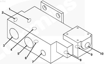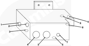 1右排燃油歧管(零件號 3094774),2自左排燃油連接塊流入的燃油(抽吸未經過濾的燃油),3至左排燃油連接塊的回油,4自右排噴油器回油管和噴油泵溢流管/EHAB(兩條管路)的回油,5流至 EHAB 的燃油(抽吸未經過濾的燃油),6自左排燃油歧管流入的燃油(經過濾的增壓燃油),7流至左排燃油歧管的燃油(未經過濾的增壓燃油),8自輸油泵流入的燃油(未經過濾的增壓燃油),10流至 EHAB/噴油泵進口的燃油(經過濾的增壓燃油),