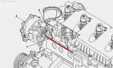 • 來(lái)自機(jī)油濾清器的機(jī)油流過(guò)前齒輪室蓋后面、缸體前部的一個(gè)油道供應(yīng)至主油道