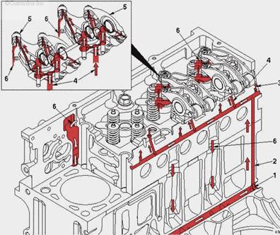 • 來(lái)自缸體的機(jī)油流入缸蓋中的油道,分別流入搖臂軸座和凸輪軸軸頸