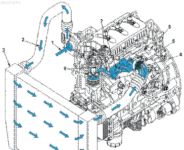 1、至渦輪增壓器進氣口, 2、至空空中冷器的增壓后空氣,3、空空中冷器,4、進氣管接頭,5、進氣加熱器,6、進氣歧管,7、缸蓋進氣口,8、進氣門,