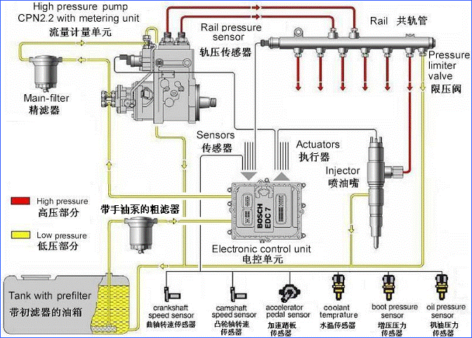 濰柴動力國三電控柴油機故障診斷及排除 造成柴油發(fā)動機的故障原因 濰柴國三柴油機是在嚴格的質(zhì)量保證體系下設(shè)計和生產(chǎn)制造的,每一臺出廠的柴油機都經(jīng)過規(guī)定的測試。同時柴油機又是一種精密機械,其功效要得到長久保證,與正常的維護保養(yǎng)密不可分。引起柴油機早期失效,一般有以下幾個原因: 1.違章操作,管理和使用不善; 2.不按規(guī)定進行維護和保養(yǎng)甚至以修代養(yǎng); 3.配件制造不良,特別是貪圖便宜購買到假冒偽劣產(chǎn)品,將大大縮短柴油機的壽命; 4.燃油和潤滑油牌號選用不當或不合格 . 柴油機故障診斷原則和方法 柴油機故障成因復雜,有時故障顯現(xiàn)是類似的,但產(chǎn)生原因并非一樣。為提高故障診斷的準確性,避免或少走彎路,建議客戶按以下原則判斷處理故障: 針對特征,聯(lián)系原理; 弄清現(xiàn)象,不漏點滴; 由簡到繁,由表及里; 按系分段,檢查分析。 柴油機故障常用的診斷方法一般有: 1)觀察法:通過觀察柴油機的排煙等故障特征,判斷故障情況(圖1 ) 2)聽診法:根據(jù)柴油機異常聲音憑聽覺判斷故障部位性質(zhì)及程度(圖2) 3)斷缸法:停止某缸工作,借以判斷故障是否出現(xiàn)在該缸。斷缸法一般是向懷疑出現(xiàn)故障的氣缸停止供油,比較斷缸前后發(fā)動機的狀態(tài)變化,為進一步查找故障部位或原因縮小范圍 4)比較法:對某些總成或零部件,采用更換的辦法確定是否存在故障 以上為機械方面故障的判斷方法,在國三柴油機上同樣適用,機械故障可參照國二故障排除方法排除 5)故障診斷燈:當車出現(xiàn)故障時,可以通過整車儀表盤上的閃碼燈讀出閃碼,參照閃碼表初步判斷錯誤原因 6)專用工具:故障診斷儀故障診斷儀可以進行較進一步的判斷 故障一:柴油機不能起動 柴油機是壓燃式內(nèi)燃機。柴油機的順利起動,不僅需要大量燃油充分霧化后噴入氣缸,而且要求氣缸內(nèi)空氣壓縮后具有一定的溫度和壓力,這樣才能使柴油自燃。因此柴油機不能順利起動,原因一般在起動系統(tǒng)、電控燃油系統(tǒng)、進排氣系統(tǒng)或柴油機配合間隙上。客戶可根據(jù)故障的伴隨特征,按步驟進行分析判斷。 1.1 起動機不工作 對于起動機受ECU控制的整車,在啟動時ECU首先檢查空檔信號,然后輸出一個電流驅(qū)動起動繼電器,繼電器接通后電瓶帶動起動機起動。 檢查時有幾個要素:空檔開關(guān)、起動繼電器、電瓶、車下停車開關(guān)的關(guān)聯(lián) Ø 檢查是否掛在空檔位置 Ø 檢查車下停車開關(guān)的位置(應處于斷開狀態(tài)) Ø 檢查空檔開關(guān)(一般安裝在變速箱上)及接線是否完好,試著使用緊急起動(點火開關(guān)持續(xù)按下5秒以上) Ø 檢查電瓶電壓是否過低,以致不能帶動起動機 Ø 起動機繼電器及接線是否完好 Ø 檢查起動機是否已燒壞 Ø 點火開關(guān)及起動開關(guān)是否已壞 1.2 軌壓無法建立(起動機能正常工作,但無法起動) 共軌系統(tǒng)對燃油油路要求較高,低壓油路(油箱 粗濾 精濾,回油)、高壓油路(高壓油泵 共軌高壓油管 噴油器)都要保證密閉。任何一個環(huán)節(jié)出了問題,軌壓都不能正常建立,提示主機廠對整個燃油油路高度重視。 Ø 檢查油箱油位是否過低 Ø 檢查手壓泵是否工作正常 Ø 檢查低壓油路是否有氣,并排空氣(有時低壓油路泄漏不明顯,需要仔細檢查) 排氣方法:主要排粗濾里面的空氣。松開粗濾上的放氣螺栓,用手壓動粗濾器上的手壓泵,直至放氣螺栓處持續(xù)出油為止 Ø 低壓油路空氣排凈后仍不能起動柴油機,則判斷高壓油路有空氣,也需要排出高壓油路的空氣 排氣方法:松開某缸高壓油管,用起動機帶動柴油機運轉(zhuǎn)直至高壓油管持續(xù)出油為止!(不建議經(jīng)常拆卸高壓油管接頭!) Ø 檢查高壓油路有無泄漏 Ø 檢查油路是否通暢,檢查柴油濾清器是否堵塞,建議及時更換柴油濾芯 檢查方法:松開精濾出口螺栓,用起動機帶動柴油機運轉(zhuǎn),看是否有柴油噴出或流出,若只有少量柴油流出,則可以判定濾芯堵塞 Ø 檢查軌壓傳感器初始電壓值是否在500mV左 右,或設(shè)定軌壓是否為300-500bar(用KTS故障診斷儀),若不正常首先檢查接插件是否牢靠。若無檢查設(shè)備,可以拔掉軌壓傳感器接插件嘗試再起動 Ø 檢查流量計量單元是否完好,拔掉接插件嘗試再起動 1.3 噴油器線束、傳感器線束、整車線束接插件未插好或者線束斷路或短路 Ø 檢查接插件的安裝,用萬用表(最好接 線路檢查儀) 按照線路圖的指針定義檢查線路的通斷 1.4 曲軸信號和凸輪軸信號喪失 柴油機上安裝兩個轉(zhuǎn)速傳感器,分別在飛輪殼和高壓油泵外側(cè)。功能分別為:曲軸位置傳感器和判缸傳感器。電控發(fā)動機的噴油正時取決于這兩個傳感器。出現(xiàn)柴油機不能起動情況,兩個信號全部丟失 Ø 兩信號全部丟失可能的原因 ①傳感器損壞,線束短路或斷路 ②傳感器固定不牢,造成傳感器與感應齒之間間隙過大或過小(一般為1±0.5mm) 排除方法:檢查傳感器是否損壞,線束是否連接良好,傳感器是否松動等 注:拆裝高壓油泵及飛輪后的安裝應嚴格按照相關(guān)工藝文件執(zhí)行,以確保信號同步 故障二:柴油機啟動困難 Ø 柴油機啟動困難的原因及排除方法 ①柴油機較長時間沒有運轉(zhuǎn):回油管要伸在柴油液面下 ②低壓管路有少量空氣:排氣 ③曲軸轉(z