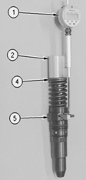 瞬間按住預(yù)設(shè)按鈕以便停止數(shù)字式千分表上的“P”在千分表右上角閃動. 此時顯示屏幕會顯示87.00 mm. 將1U-8869千分表和9U-5233磁性固定裝置擺放在單體泵上正確的位置. 確保磁性底座的磁性固定裝置放在單體泵上的推桿上(4)而加長桿坐在單體泵的杠(5)上端平面.