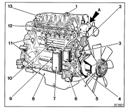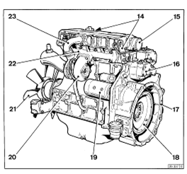 14 升降點,15曲軸箱呼吸閥,16 調速器,17 SAE護蓋,18調速輪,19 啟動馬達,20 廢氣渦輪增壓器,21鼓風機,22 排氣總管,23進氣口總管,