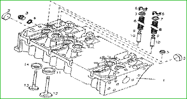 1.缸蓋 2.水套堵 3.螺塞 4.密封墊 5搖臂堵頭 6.氣門彈簧鎖片 7.彈簧座 8.氣門彈簧 9.o型圈 10.氣門導管 11.進氣門座 12.進氣門 13.排氣門 14.排氣門座