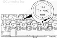 在與螺栓頭部上的小圓點鄰近的缸蓋上做標記。此標記用來幫助將螺栓擰緊到要求的角度。