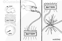 蓄電池可能會有易爆性氣體逸出。為了盡可能避免人身傷害,在維護蓄電池前,必須保持康明斯B3.3和QSB3.3發動機艙通風良好。為避免產生電弧,應首先拆下負極 (-) 蓄電池電纜,并最后連接負極 (-) 蓄電池電纜。