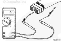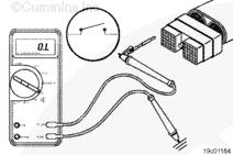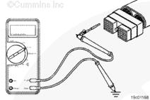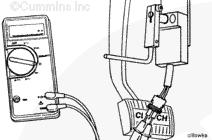 調整萬用表以便測量電阻。然后將一根測試導線插入 OEM 線束接頭的離合器踏板位置開關信號觸針。將另一根測試導線插入康明斯離合器踏板位置開關回路觸針。將鱷魚夾與萬用表表筆相連。