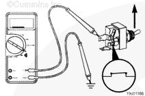 從康明斯巡航控制 ON/OFF 開關輸入觸針上拆下測試導線,然后檢查所有其它觸針。測量電阻。萬用表必須顯示開路(100K 歐姆或更大)。