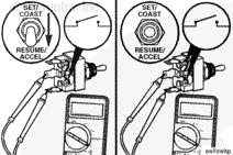 萬用表的一支表筆接觸開關的 SET/COAST(設置/滑行)端子。用萬用表的另一支表筆接觸底盤接地端。將該開關撥到 RESUME/ACCEL(恢復/加速)位置,然后再到 SET/COAST(設置/滑行)位置。測量電阻。