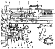 7將支架(14)定位到Perkins1106A/C發(fā)動機缸體和噴油泵上。將螺栓(15)安裝到Perkins1106A/C發(fā)動機缸體上并用手擰緊。
