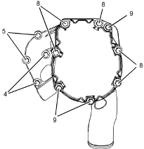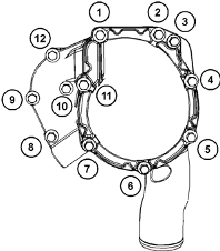 Perkins1106A/C發(fā)動(dòng)機(jī)水泵-拆卸 拆卸步驟 開(kāi)始: a.拆卸風(fēng)扇和風(fēng)扇皮帶輪。請(qǐng)參閱《Perkins1106A/C發(fā)動(dòng)機(jī)拆解和組裝》,“風(fēng)扇-拆卸和安裝”。 注意:在檢驗(yàn)、保養(yǎng)、測(cè)試、調(diào)整及維修產(chǎn)品時(shí),務(wù)必留心,確保液體盛裝在容器中。在打開(kāi)任何腔室或拆解任何儲(chǔ)有液體的部件之前,要準(zhǔn)備好用合適的容器收集液體。按照本地法規(guī)和指令處置所有液體。 1.從冷卻系統(tǒng)將冷卻液排入合適的容器以便保存或廢棄這些冷卻液。有關(guān)正確的步驟,請(qǐng)參閱《Perkins1106A/C發(fā)動(dòng)機(jī)操作和保養(yǎng)手冊(cè)》,“冷卻系統(tǒng)冷卻液-更換”。 2.松開(kāi)軟管卡箍,將軟管從Perkins1106A/C發(fā)動(dòng)機(jī)水泵進(jìn)口上卸下。 3拆卸螺栓(4)、(5)和(8)。 注:螺栓有三種不同的長(zhǎng)度。注意三種不同長(zhǎng)度螺栓的位置。 4.將Perkins1106A/C發(fā)動(dòng)機(jī)水泵(3)從前蓋(1)上卸下。 注:如有必要,使用軟錘輕敲Perkins1106A/C發(fā)動(dòng)機(jī)水泵來(lái)松開(kāi)Perkins1106A/C發(fā)動(dòng)機(jī)水泵。 5.拆下密封墊(2)。 6.如有必要,從Perkins1106A/C發(fā)動(dòng)機(jī)水泵上卸下蓋。按照步驟6.a至步驟6.c以拆下蓋。 a.拆下螺栓(9)。 b.拆下蓋(7)。 c.拆下密封墊(6)(未顯示)。 Perkins1106A/C發(fā)動(dòng)機(jī)水泵-安裝 安裝步驟 注意:在檢驗(yàn)、保養(yǎng)、測(cè)試、調(diào)整及維修產(chǎn)品時(shí),務(wù)必留心,確保液體盛裝在容器中。在打開(kāi)任何腔室或拆解任何儲(chǔ)有液體的部件之前,要準(zhǔn)備好用合適的容器收集液體。按照本地法規(guī)和指令處置所有液體。 1.確保Perkins1106A/C發(fā)動(dòng)機(jī)水泵清潔且無(wú)磨損或損壞。如有必要,更 換Perkins1106A/C發(fā)動(dòng)機(jī)水泵。 2如有必要,將蓋安裝到Perkins1106A/C發(fā)動(dòng)機(jī)水泵。遵循步驟2.a至2.d,安裝蓋。 a.清潔蓋(7)的密封墊表面。 b.將新密封墊(6)(未顯示)定位到Perkins1106A/C發(fā)動(dòng)機(jī)水泵(3)上。 c.將蓋(7)安裝到Perkins1106A/C發(fā)動(dòng)機(jī)水泵(3)上。 d將螺栓(9)安裝到蓋(7)上。用手?jǐn)Q緊螺栓。 3清潔前蓋(1)的密封墊表面。 4將工具(A)安裝到位置(X)中。 5使用工具(A)對(duì)準(zhǔn)新密封墊(2)與前蓋(1)。將密封墊安裝到前蓋上。 6對(duì)準(zhǔn)Perkins1106A/C發(fā)動(dòng)機(jī)水泵(3)與工具(A)。將Perkins1106A/C發(fā)動(dòng)機(jī)水泵安裝到前蓋(1)上。 注:確保Perkins1106A/C發(fā)動(dòng)機(jī)水泵的齒輪與噴油泵的齒輪相嚙合。 蓋板的螺栓(9)。 (5)M8×30mm (4)M8×75mm (8)M8×65mm 7安裝螺栓(4)、(5)和(8)。請(qǐng)參閱插圖92。用手?jǐn)Q緊螺栓。 注:確保所有不同長(zhǎng)度的螺栓安裝位置正確。 8.拆下工具(A),并安裝剩余螺栓(4)。 9.按圖93中的順序擰緊螺栓(4)、(5)、(8)和(9)至扭矩為22N·m(195lbin)。 10.將軟管安裝到Perkins1106A/C發(fā)動(dòng)機(jī)水泵進(jìn)口。牢固地?cái)Q緊軟管卡箍。 11向冷卻系統(tǒng)加注冷卻液。有關(guān)正確的步驟,請(qǐng)參閱《Perkins1106A/C發(fā)動(dòng)機(jī)操作和保養(yǎng)手冊(cè)》,“冷卻系統(tǒng)冷卻液-更換”。 結(jié)束: a.安裝風(fēng)扇和風(fēng)扇皮帶輪。請(qǐng)參閱《Perkins1106A/C發(fā)動(dòng)機(jī)拆解和組裝》,“風(fēng)扇-拆卸和安裝”。