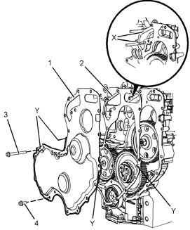 b.將新密封墊(2)安裝到前蓋(1)上。將三個定位工具(Y)(未顯示)嚙合到前蓋的孔中。
