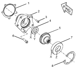 d.在軸承(7)和(4)的外表面(X)處涂敷一薄層連續(xù)的工具(B)。將Perkins1106A/C發(fā)動(dòng)機(jī)附件驅(qū)動(dòng)器Perkins1106A/C發(fā)動(dòng)機(jī)機(jī)殼體(2)放置在適當(dāng)?shù)闹Ъ苌稀X輪組件按入Perkins1106A/C發(fā)動(dòng)機(jī)附件驅(qū)動(dòng)器Perkins1106A/C發(fā)動(dòng)機(jī)機(jī)殼體中。確保軸承(4)抵到Perkins1106A/C發(fā)動(dòng)機(jī)附件驅(qū)動(dòng)器Perkins1106A/C發(fā)動(dòng)機(jī)機(jī)殼體(2)中的凹槽前表面上。清除過(guò)多的固定膠。