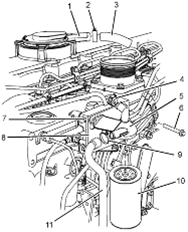 1拆下呼吸器的濾罐(10)。請參閱《Perkins1106A/C發動機操作和保養手冊》,“Perkins1106A/C發動機曲軸箱呼吸器(濾罐)-更換”。