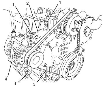 2. 移動交流發動機(4)以增加或降低皮帶張緊度。檢查皮帶張緊度時,應在兩個皮帶輪中間的地方施加45 N (10 lb ft)的力。調整正確的皮帶將下垂10 mm (0.39 inch)。