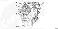 1. 發(fā)動機油底殼 2. 發(fā)動機機油濾清器 3. 自動皮帶張緊器 4. 發(fā)動機吊耳 5. 發(fā)動機機油加注口蓋。