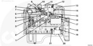 1. 發(fā)動機機油壓力/溫度傳感器 2. 燃氣質量流量傳感器 3. 發(fā)動機轉速/位置傳感器 4. 空氣壓縮機 5. 點火控制模塊 (ICM) 6. 燃料殼體 7. 進氣彎頭 8. 發(fā)動機油門執(zhí)行器 9. 油門進氣壓力傳感器 10. 點火線圈 11. 排氣背壓傳感器 12. 燃料進口接頭 13. 發(fā)動機吊耳 14. 燃料壓力調節(jié)器 15. 燃料調節(jié)器進口壓力傳感器 16. 燃料控制閥 17. 電子控制模塊 (ECM) 18. 飛輪殼體 19. 起動馬達電磁閥 20. 起動馬達 21. 爆震傳感器。