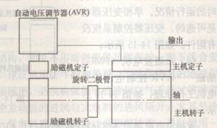 同步發(fā)電機(jī)一般由自動(dòng)電壓調(diào)節(jié)器(AVR),勵(lì)磁發(fā)電機(jī),旋轉(zhuǎn)整流器,主發(fā)電機(jī)幾個(gè)部分組成。同步發(fā)電機(jī)的構(gòu)造原理圖如下所示。